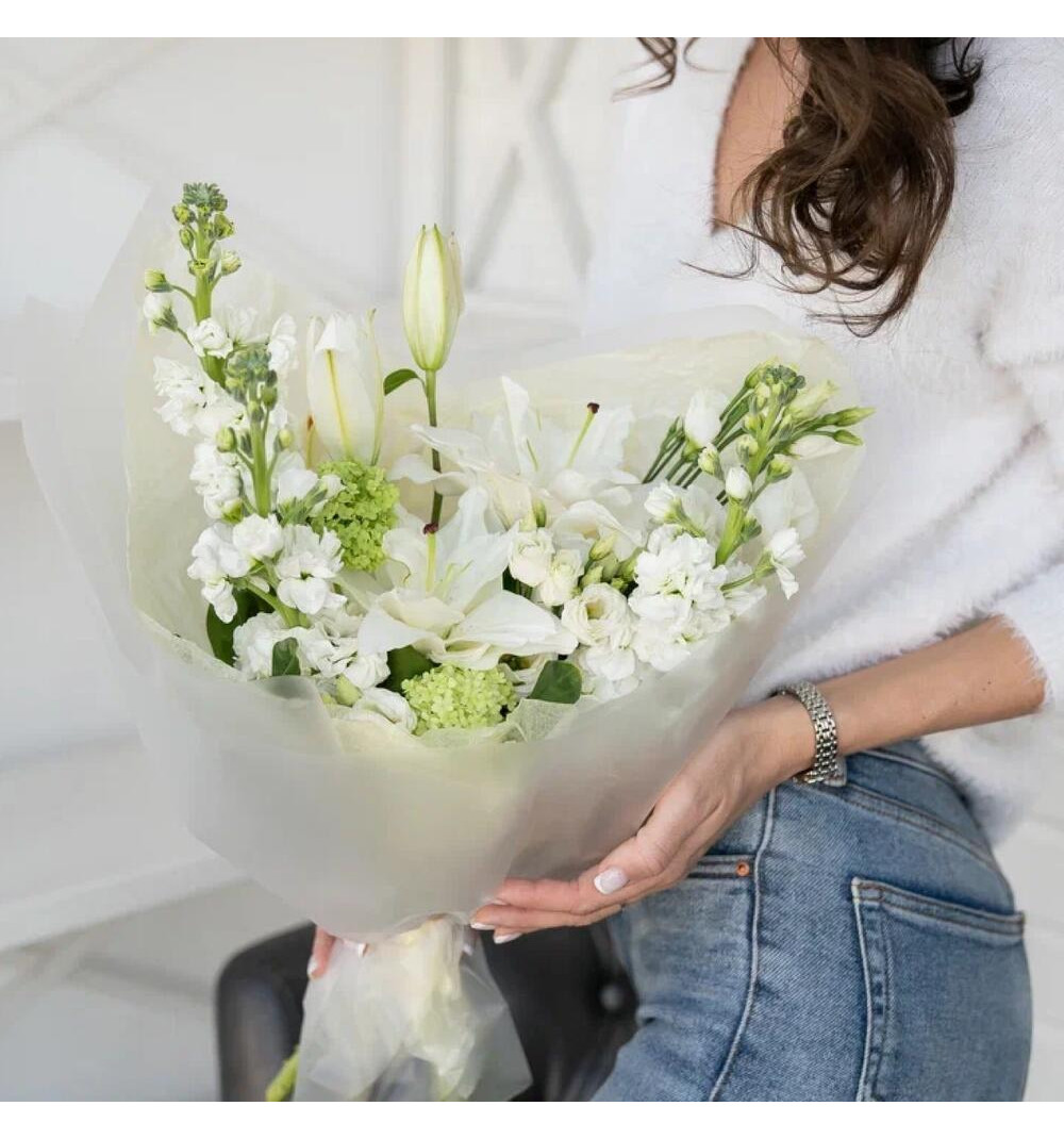 Белоснежный букет с лилией и маттиолой - это очаровательная композиция, в которой сочетаются изящные белые лилии и ароматная маттиола. Цветы этого букета олицетворяют чистоту, нежность и элегантность, что делает его идеальным подарком для особых случаев и важных событий. Прекрасная гармония белых оттенков и нежный аромат маттиолы создают атмосферу волшебства и радости. Этот букет станет замечательным воплощением вашей заботы и любви к близким людям.